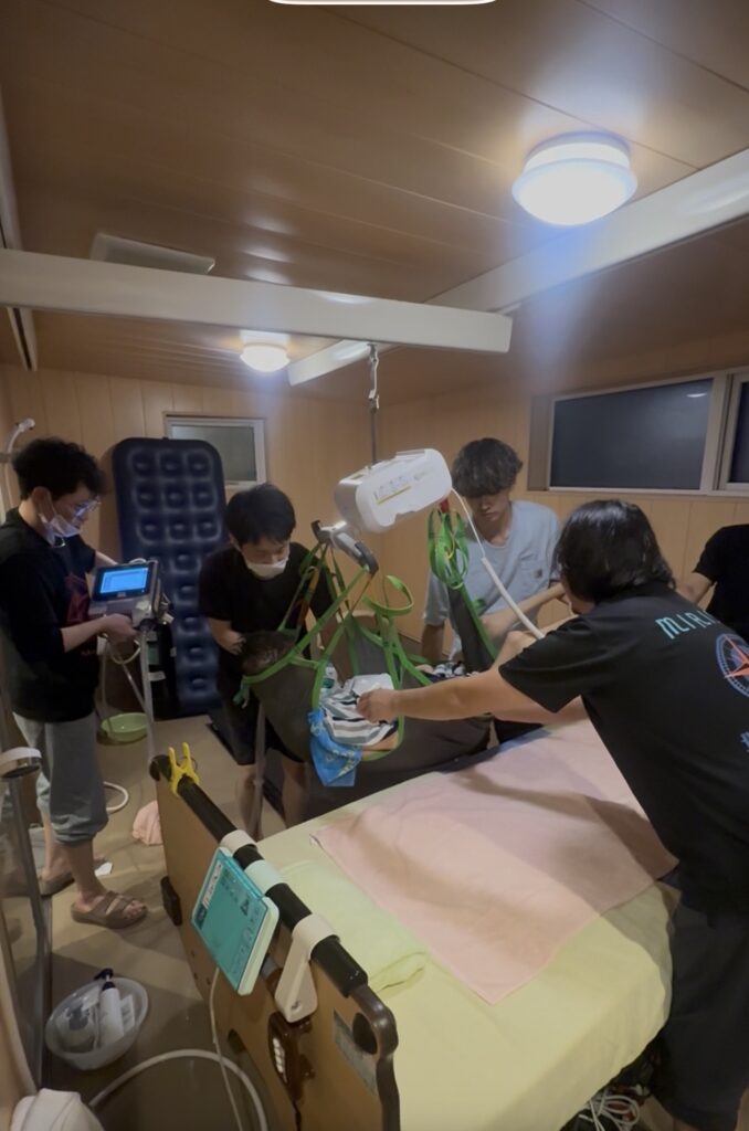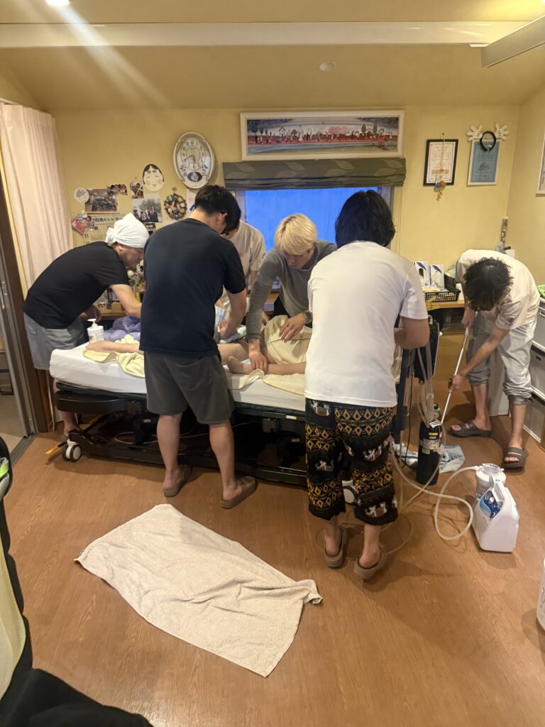 利用者様の生活の質向上、スタッフ同士でのケア内容・手技の統一を図るとともに、ご本人・ご家族から希望のあった外出時の「入浴介助方法」の確認を行う為、机上の話だけではなく実際にやってみよう!!!という事で!!!